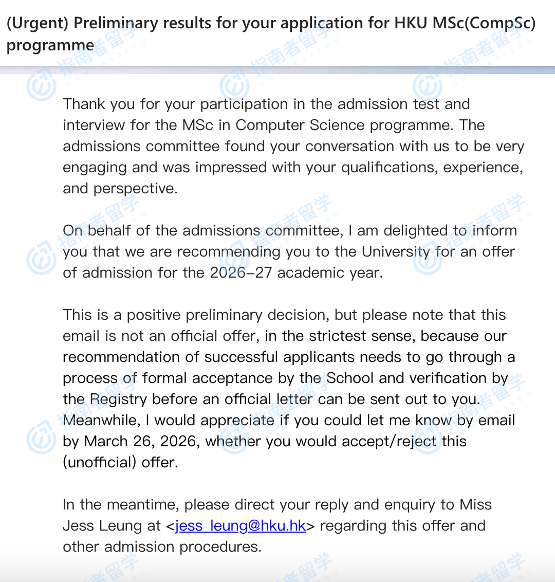香港大学计算机科学理学硕士(常规方向)研究生offer一枚