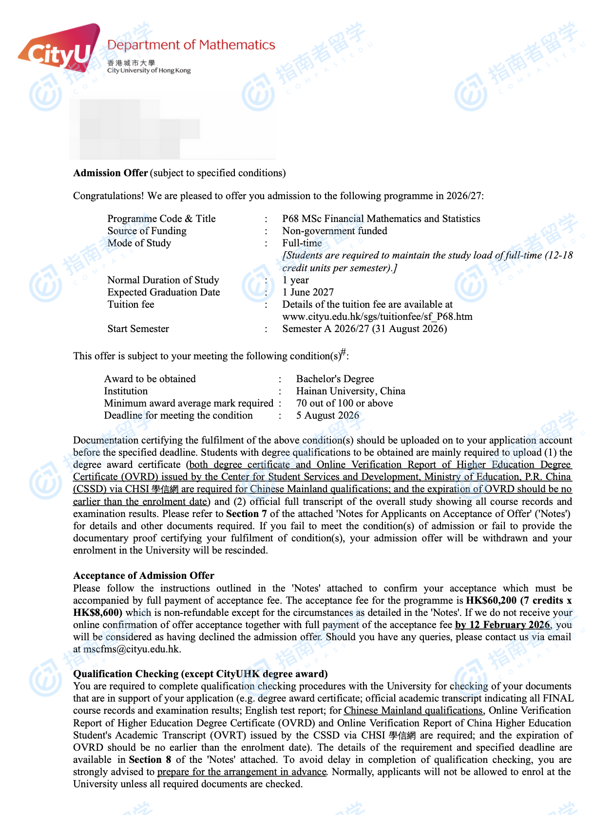 香港城市大学金融数学与统计理学硕士研究生offer一枚