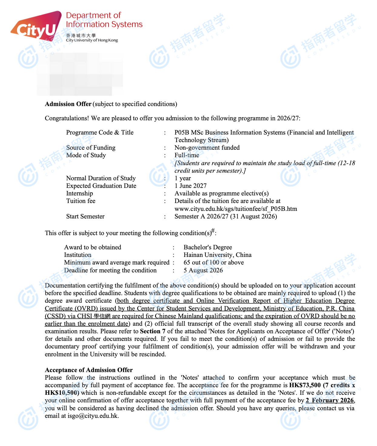 香港城市大学商务资讯系统理学硕士(金融与智能科技)研究生offer一枚