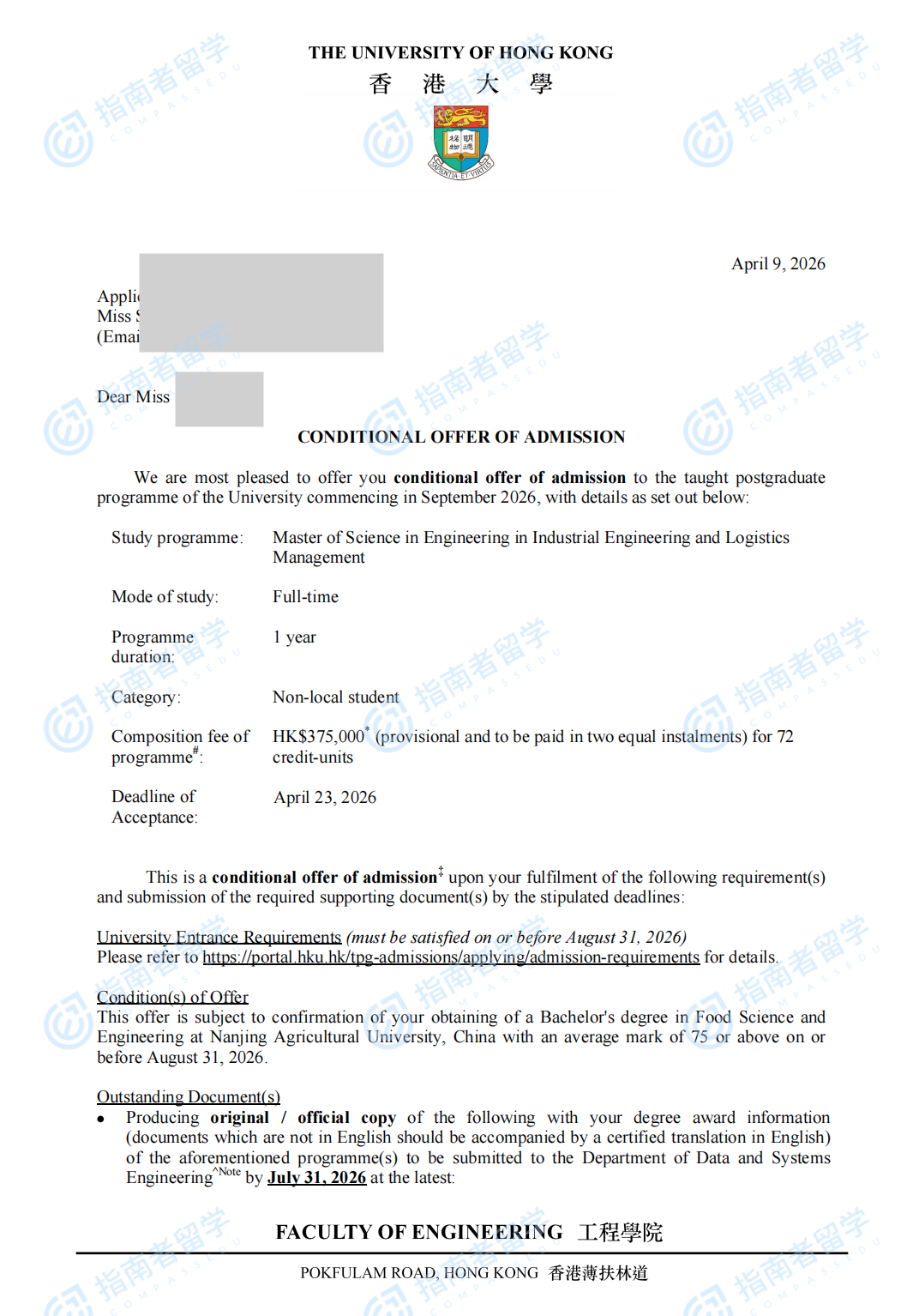 香港大学工业工程与物流管理(工程)理学硕士研究生offer一枚