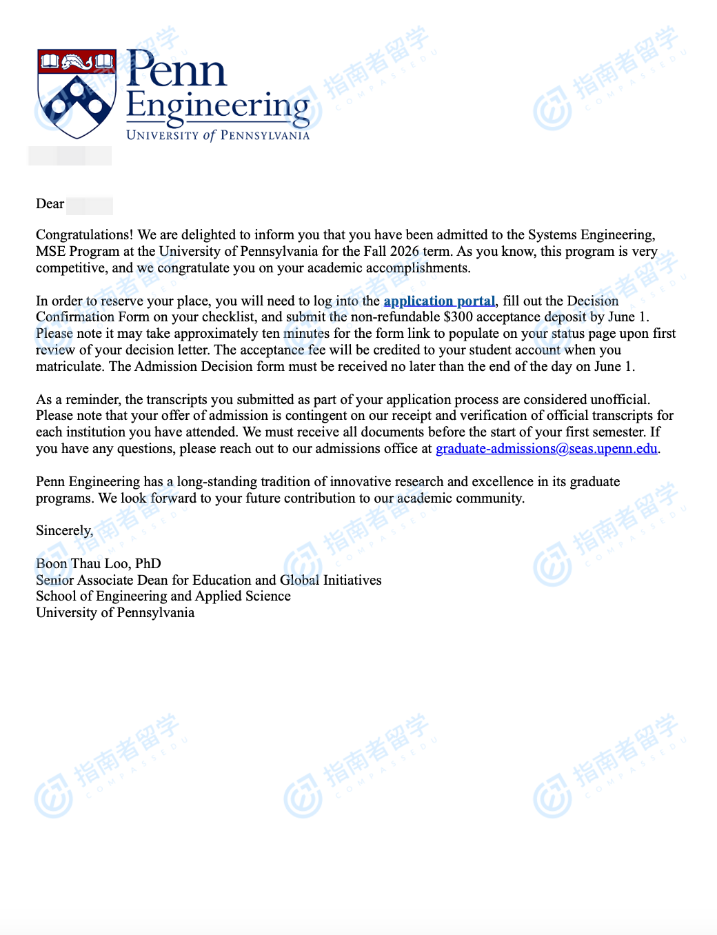 宾夕法尼亚大学系统工程硕士研究生offer一枚