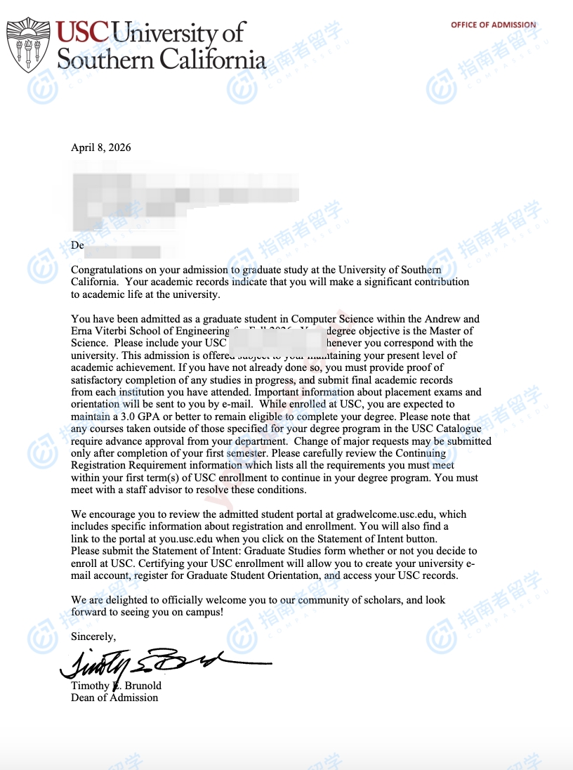 南加州大学计算机科学硕士研究生offer一枚
