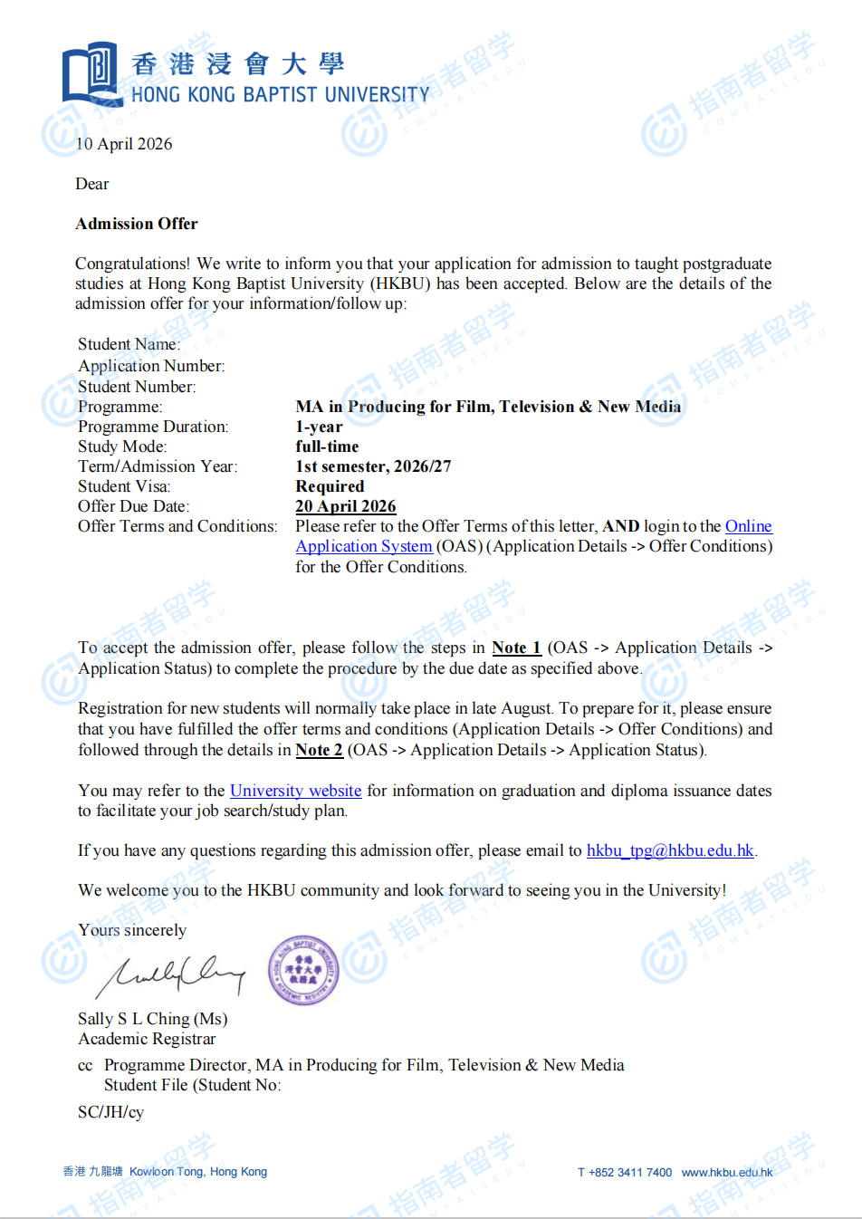 香港浸会大学影视与新媒体制片管理文学硕士研究生offer一枚