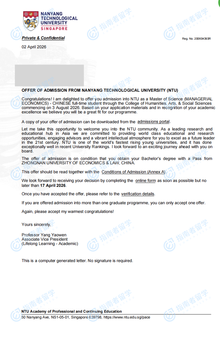 南洋理工大学管理经济学理学硕士(英文授课)研究生offer一枚