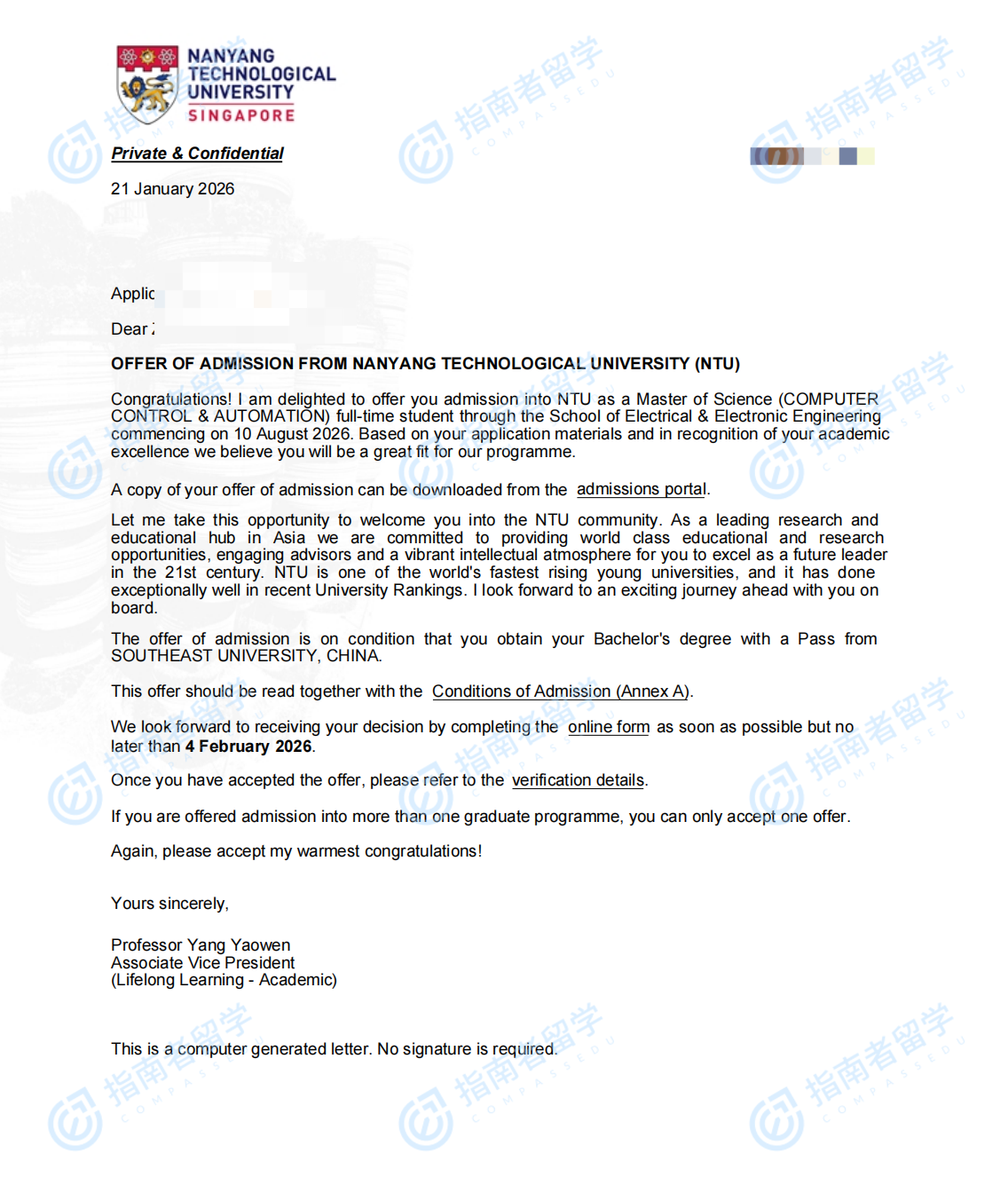 南洋理工大学计算机控制与自动化理学硕士研究生offer一枚