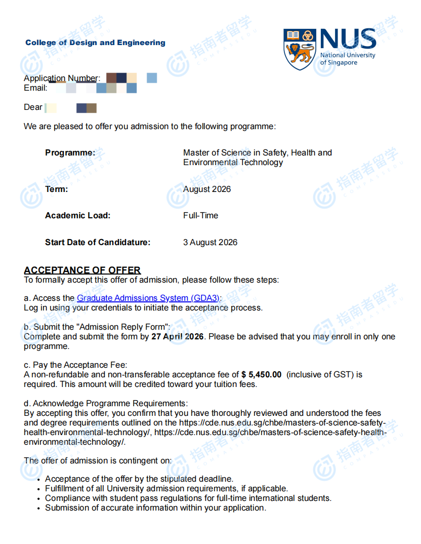 新加坡国立大学安全、健康与环境技术理学硕士研究生offer一枚