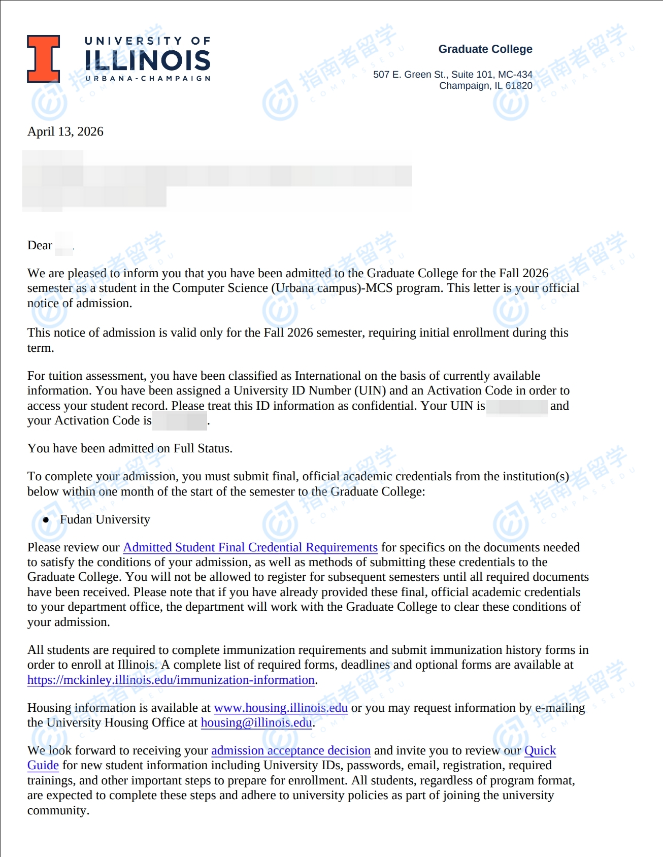 伊利诺伊大学香槟分校计算机科学硕士研究生offer一枚