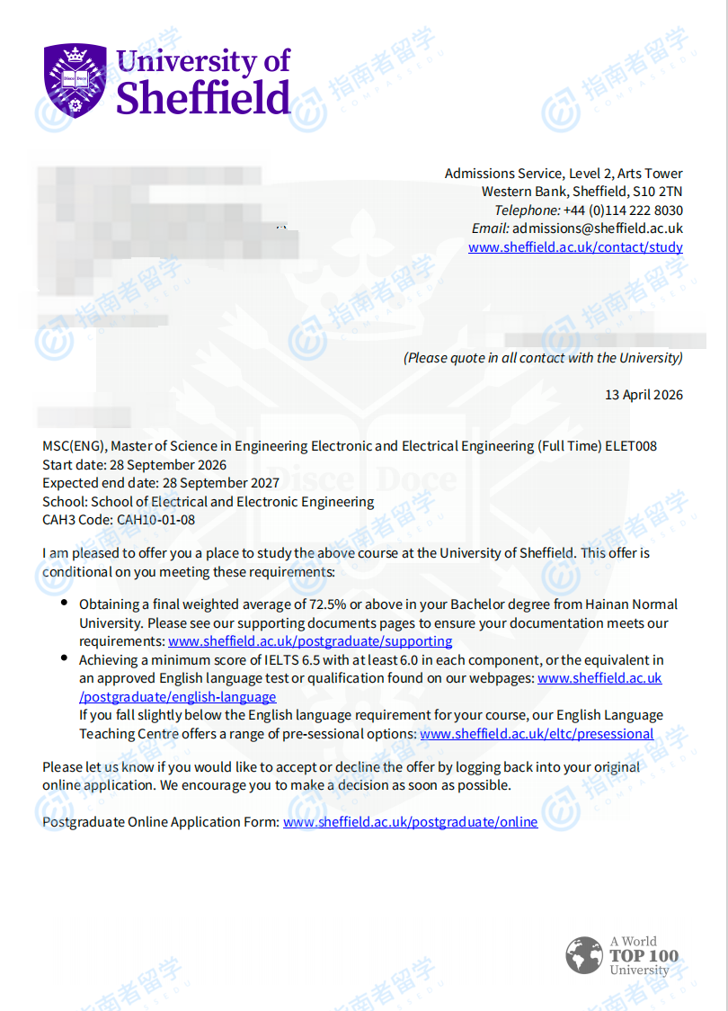 谢菲尔德大学电子与电气工程(工程)理学硕士研究生offer一枚