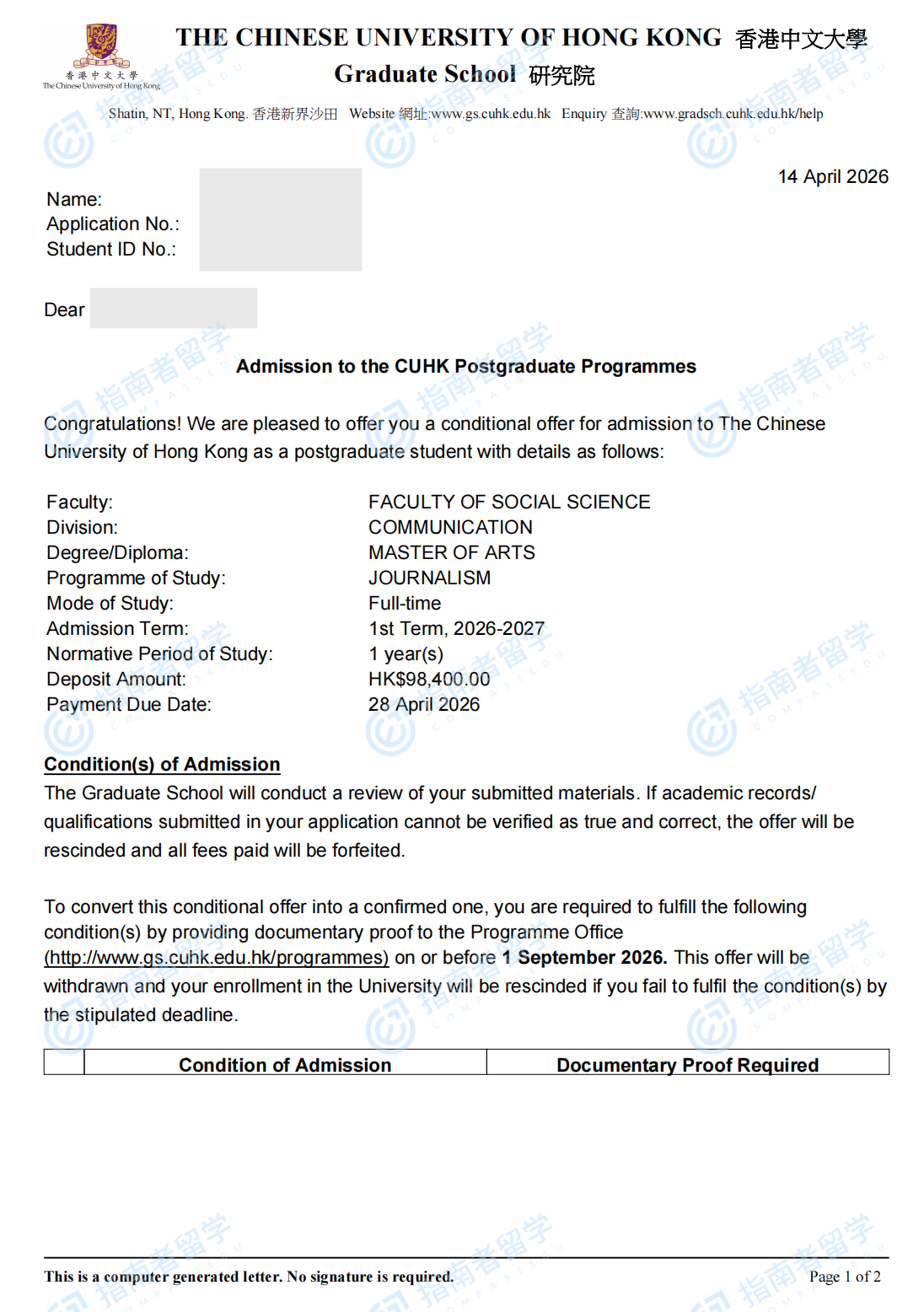 <p> 香港中文大学新闻学文学硕士课程旨在为不同背景人士提供专业及学术新闻训练。有志从事新闻工作但本科未曾修读新闻与传播的本科毕业生,可以从中大新闻学课程中学习基本的新闻知识和技巧。现职新闻工作者或其他需要与媒体接触的专业人士,也可从课程的知识训练中得益,加深其对新闻和社会时事的认知。 </p>