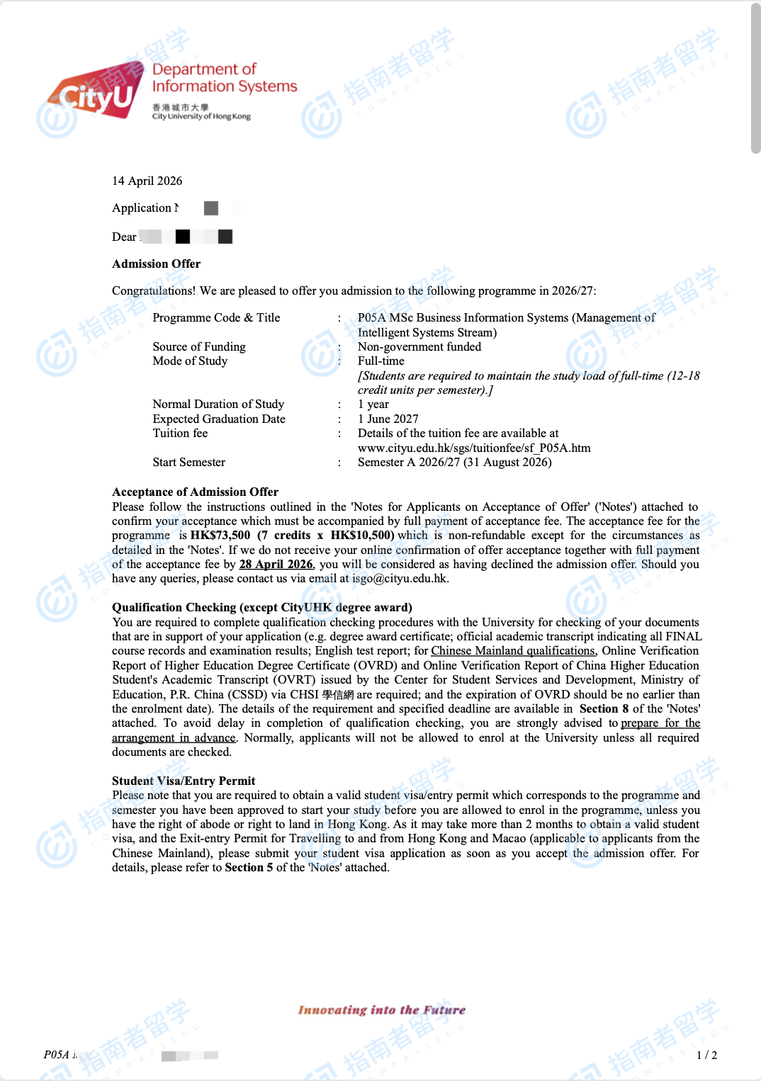 香港城市大学商务资讯系统理学硕士(智能系统管理)研究生offer一枚