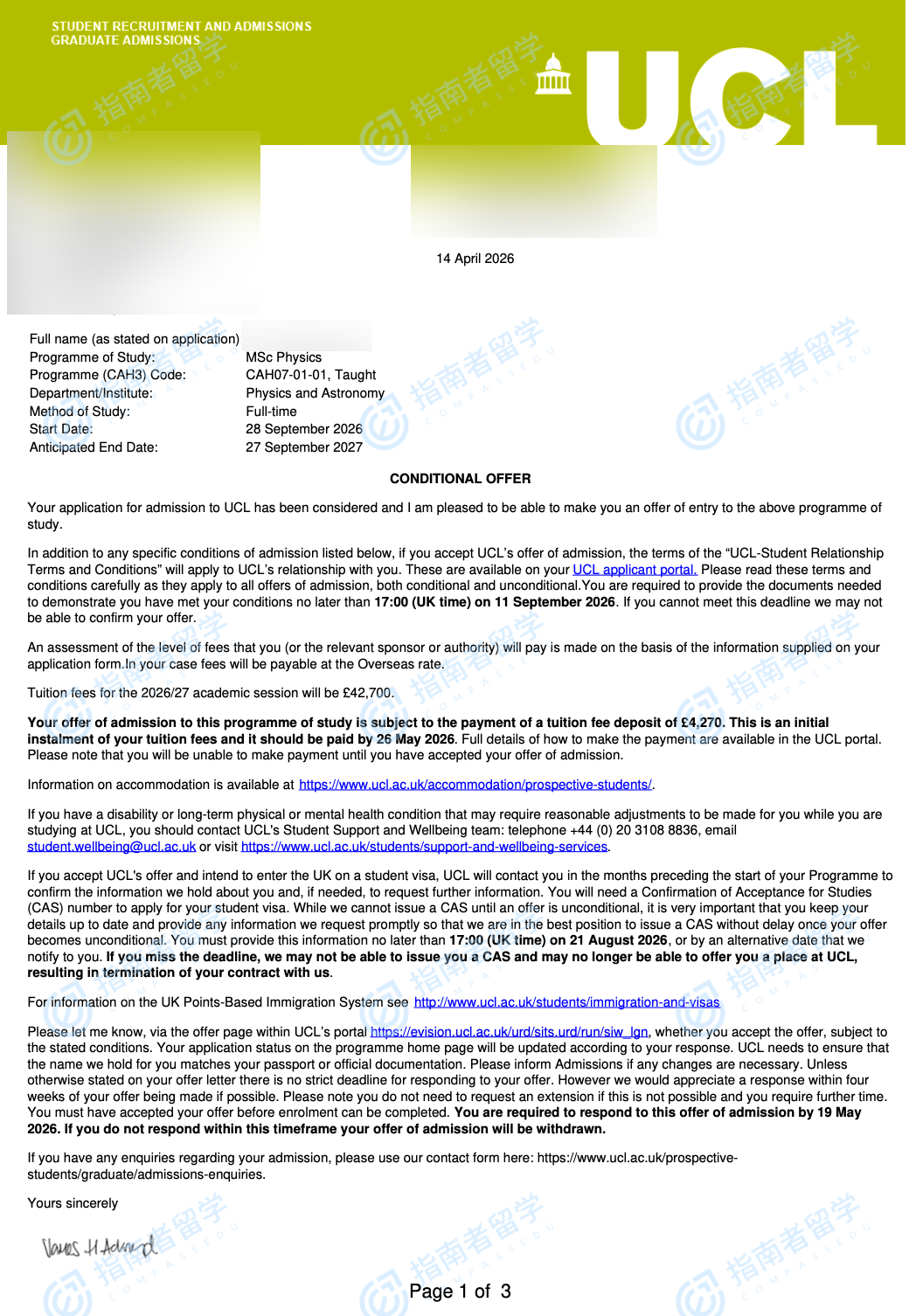 伦敦大学学院物理学理学硕士研究生offer一枚