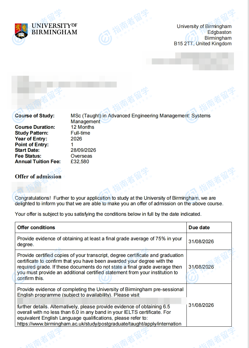 <p>在第一学期,学生将学习管理领域的核心概念;在第二学期,学生将选择一个专业方向进行精修。学生也有机会选择通识方向,根据自己的要求选择课程。所有学生都要学习第一学期的模块,为进一步专业化管理学习打下坚实的知识和技术基础。伯明翰大学高级工程管理(系统管理)理学硕士项目的课程由伯明翰商学院(BBS)的顶尖学者提供,管理内容以研究为主导,利用BBS的专业知识和声誉,为学生提供高质量的学习体验。课程主题包括战略、创新、营销、组织行为和财务管理;在第二学期,学生将转向所选择的方向,在工程学院学者的指导下探索实际管理应用,并借鉴其丰富的研究经验和产业链资源,使得自己在第一学期所学到的关键理念可以得到延伸。这一新结构可以确保学生在第一学期学习核心原理,在第二学期中应用这些原理,并有机会通过研究项目(60学分)来调查和开发当代工程管理的相关课题。</p>