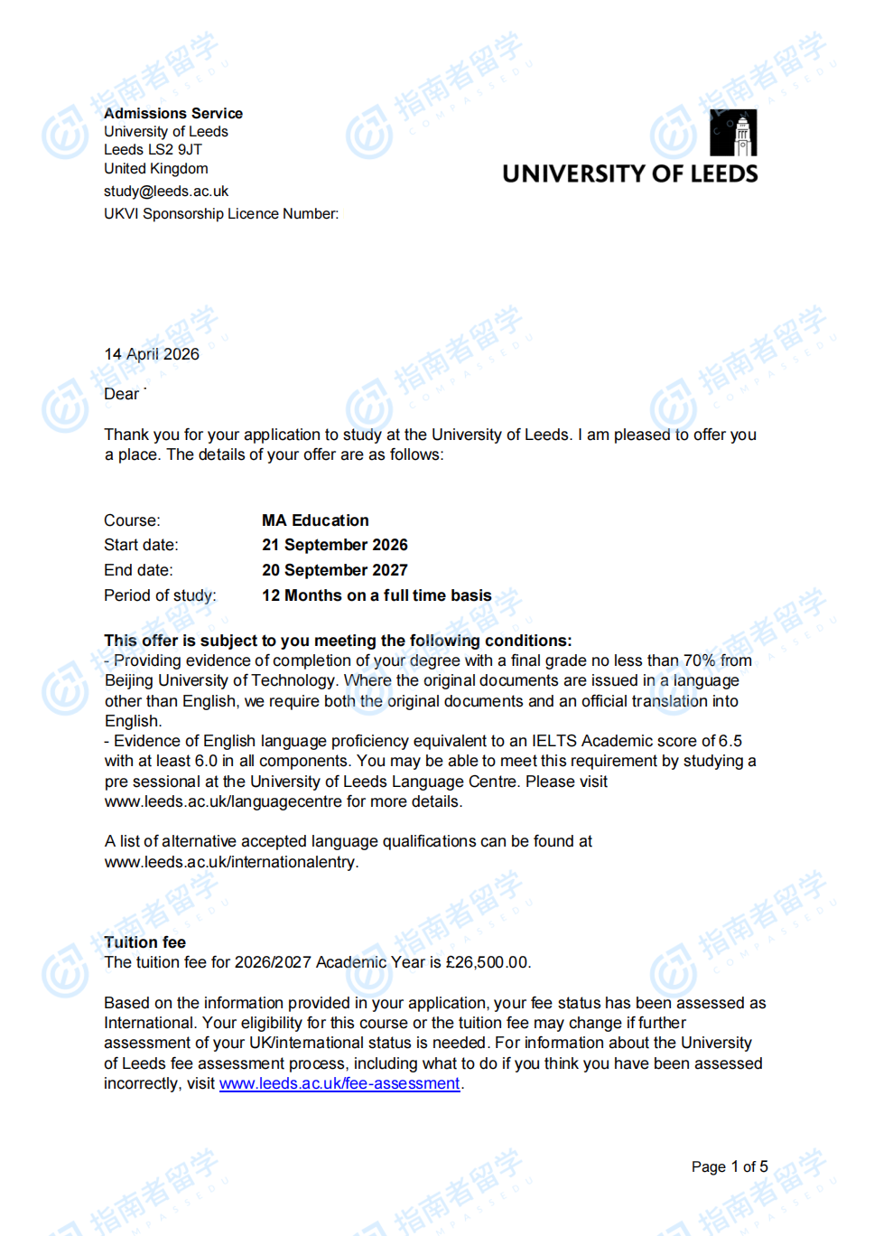 利兹大学教育学文学硕士研究生offer一枚