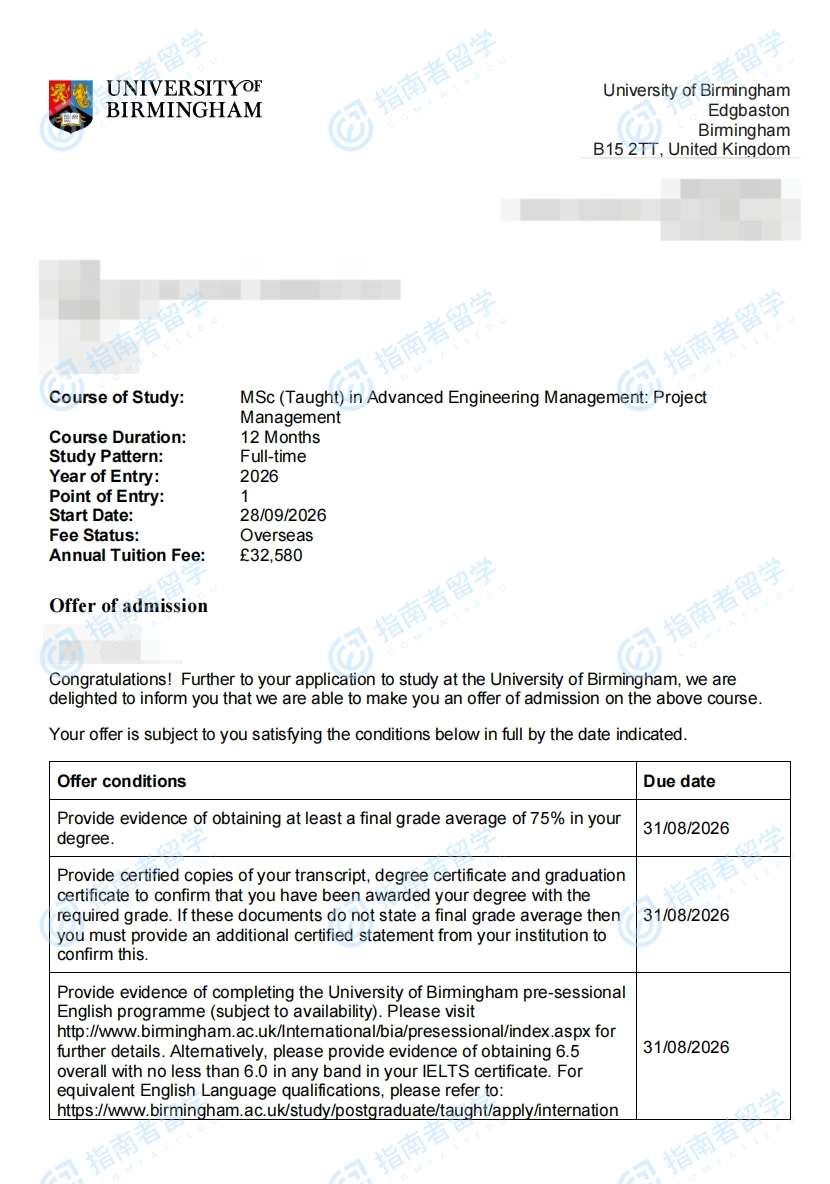 <p>在第一学期,学生将学习管理领域的核心概念;在第二学期,学生将选择一个专业方向进行精修。学生也有机会选择通识方向,根据自己的要求选择课程。所有学生都要学习第一学期的模块,为进一步专业化管理学习打下坚实的知识和技术基础。伯明翰大学高级工程管理(项目管理)理学硕士项目的课程由伯明翰商学院(BBS)的顶尖学者提供,管理内容以研究为主导,利用BBS的专业知识和声誉,为学生提供高质量的学习体验。课程主题包括战略、创新、营销、组织行为和财务管理;在第二学期,学生将转向所选择的方向,在工程学院学者的指导下探索实际管理应用,并借鉴其丰富的研究经验和产业链资源,使得自己在第一学期所学到的关键理念可以得到延伸。这一新结构可以确保学生在第一学期学习核心原理,在第二学期中应用这些原理,并有机会通过研究项目(60学分)来调查和开发当代工程管理的相关课题。</p>
