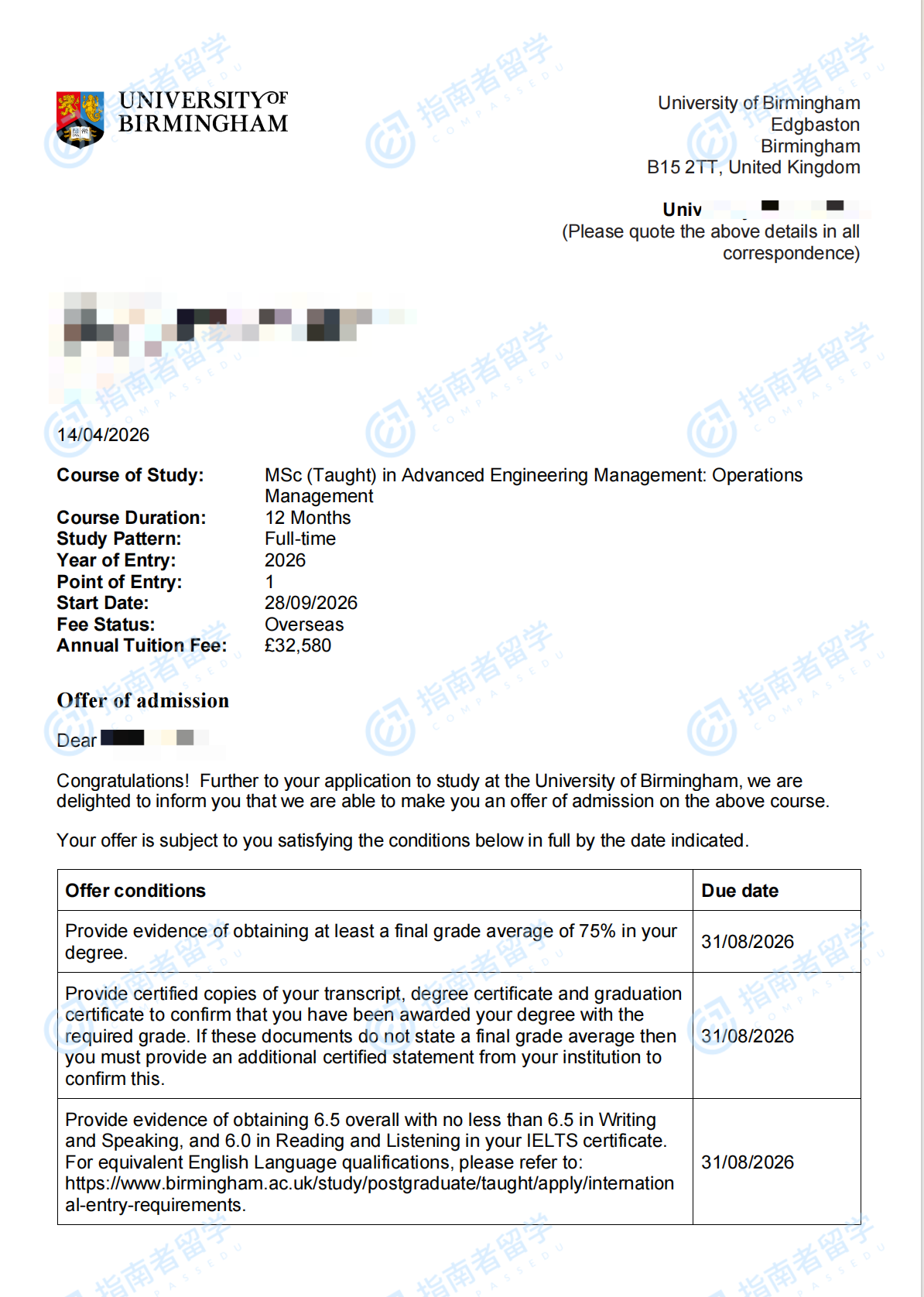 <p>在第一学期,学生将学习管理领域的核心概念。在第二学期,学生将在所设专业方向中四选一,进行精修。学生也有机会选择通识方向,根据自身要求选择课程。所有学生都要学习第一学期的模块,为进一步专业化管理学习打下坚实的知识与技术基础。伯明翰大学高级工程管理(运营管理)理学硕士项目的课程由伯明翰商学院(BBS)的顶尖学者提供,管理内容以研究为主导,利用BBS的专业知识和声誉,为学生提供高质量的学习体验。课程主题包括战略、创新、营销、组织行为和财务管理。在第二学期,学生将转向他们所选择的方向,在工程学院学者引导下探索实际管理应用,并借鉴其丰富的研究经验和产业链资源,使得自身在第一学期所学到的关键理念将得到延伸。这一新结构可确保学生在第一学期学习核心原理,在第二学期中应用这些原理,并有机会通过研究项目(60学分)来调查、开发当代工程管理的相关课题。</p>