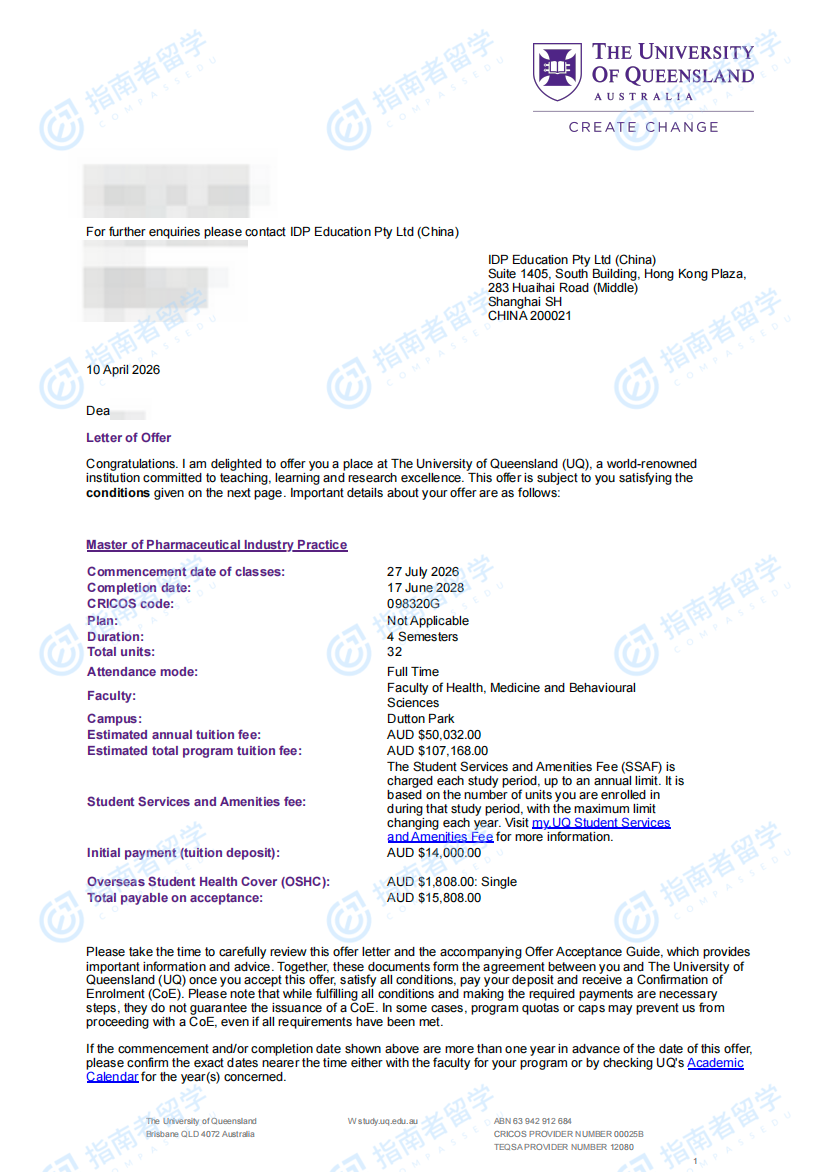 昆士兰大学制药工业实践硕士研究生offer一枚