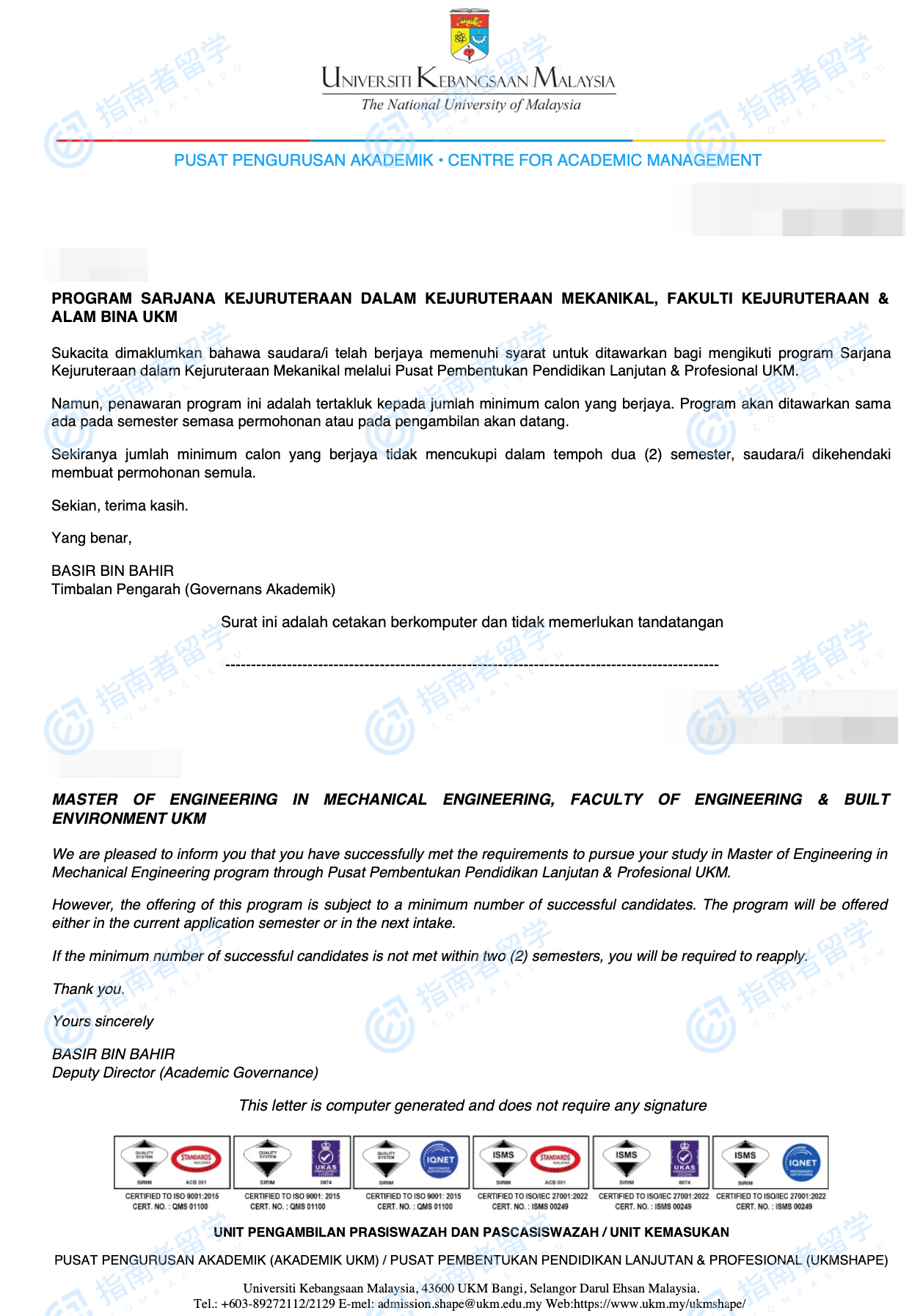马来西亚国立大学机械工程工程学硕士研究生offer一枚