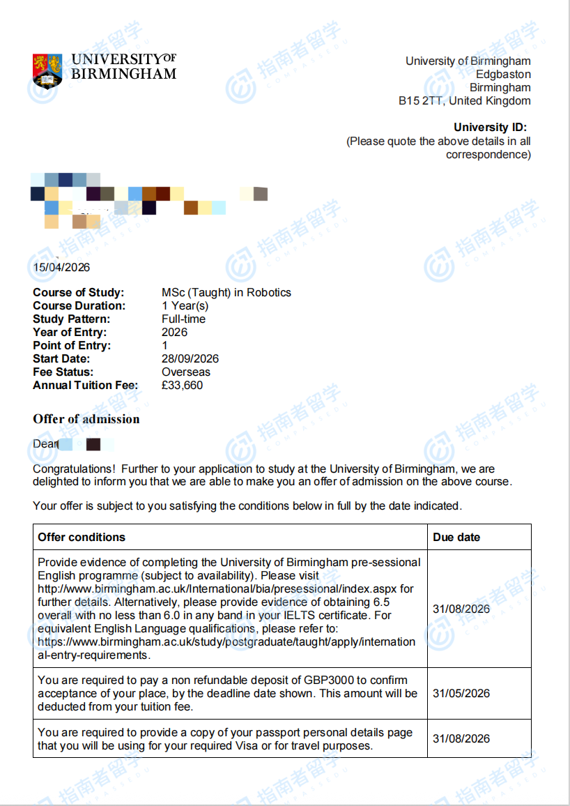 伯明翰大学机器人学理学硕士研究生offer一枚