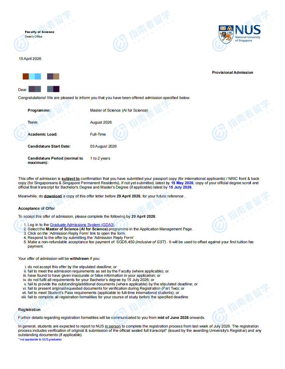 新加坡国立大学科学智能理学硕士研究生offer一枚