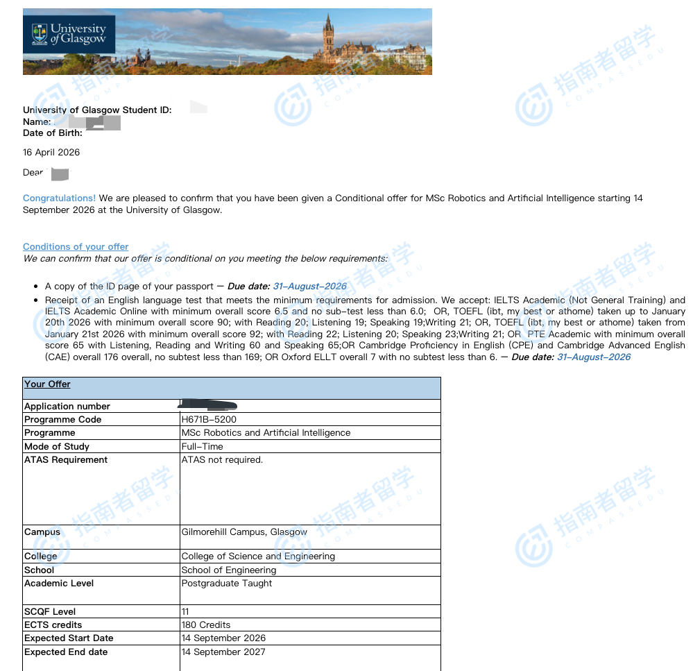 格拉斯哥大学机器人与人工智能理学硕士研究生offer一枚
