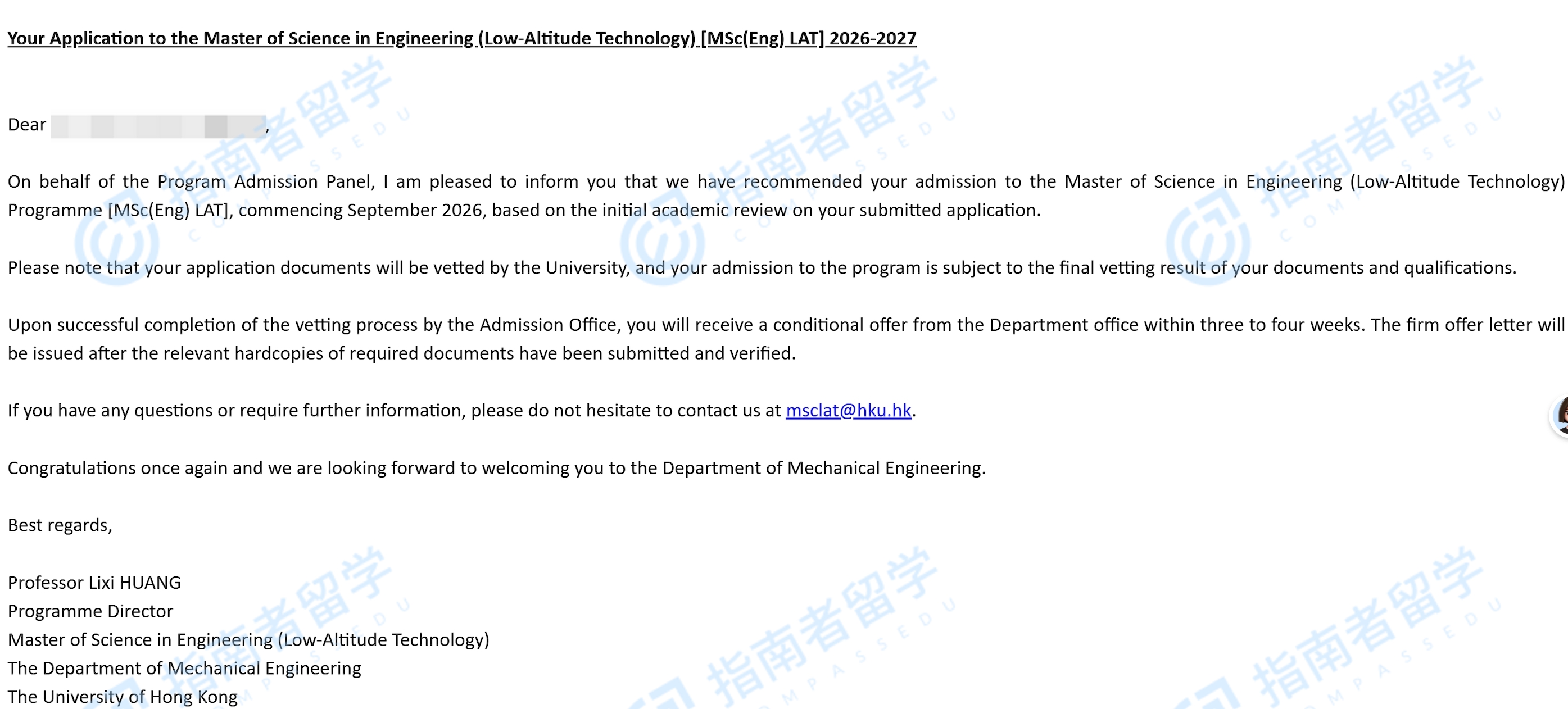 香港大学低空科技(工程)理学硕士研究生offer一枚