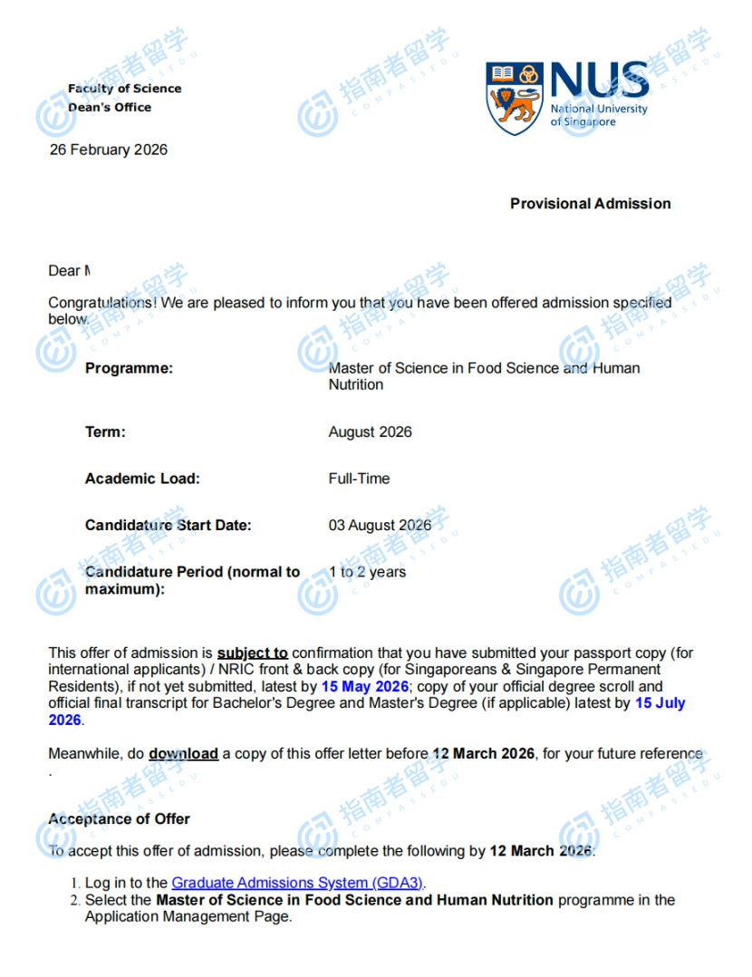 新加坡国立大学食品科学与人类营养学理学硕士项目包括食品生物中的微生物与安全,发酵;现代食品加工技术;基于证据的功能性食物;现代分析科学和人类营养等。</p>