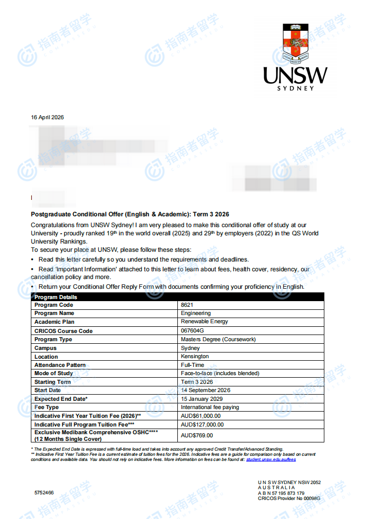 新南威尔士大学可再生能源工程工学硕士研究生offer一枚