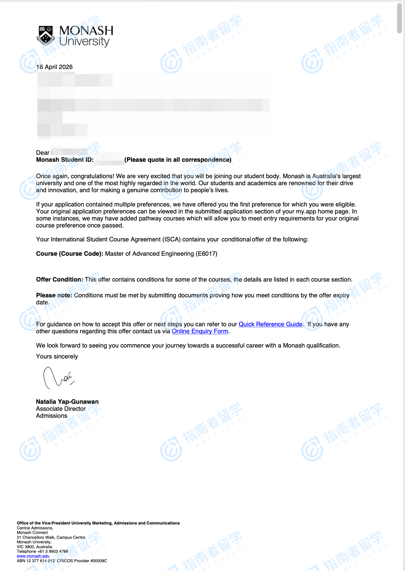 莫纳什大学电气工程工学硕士研究生offer一枚