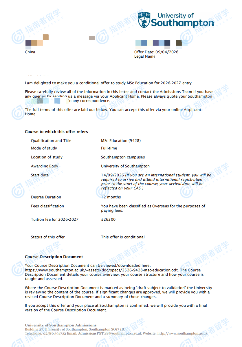 南安普顿大学教育学理学硕士研究生offer一枚