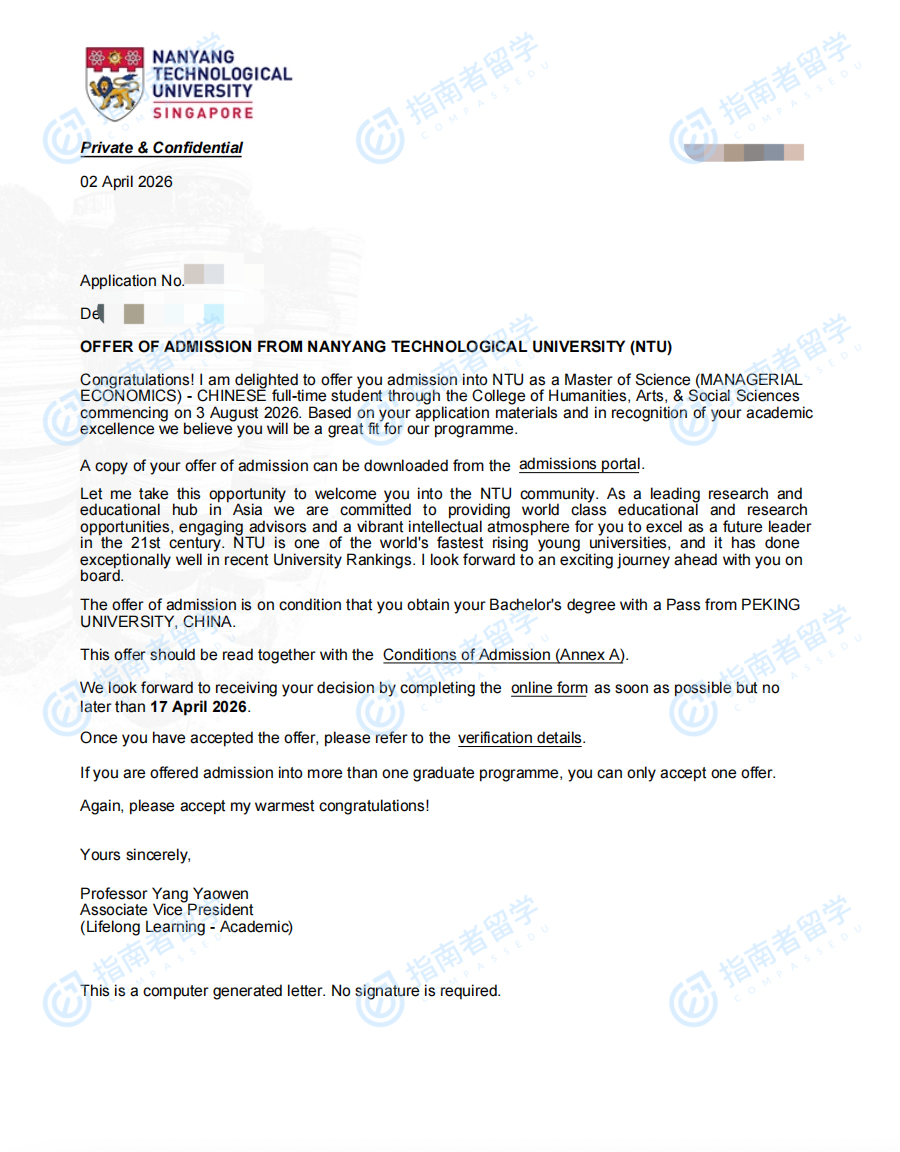 南洋理工大学管理经济学理学硕士(中文授课)研究生offer一枚