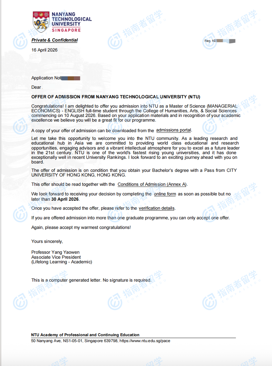 南洋理工大学管理经济学理学硕士(英文授课)研究生offer一枚