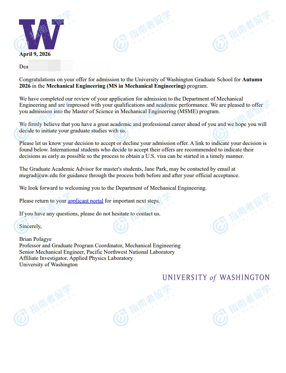 华盛顿大学机械工程理学硕士研究生offer一枚