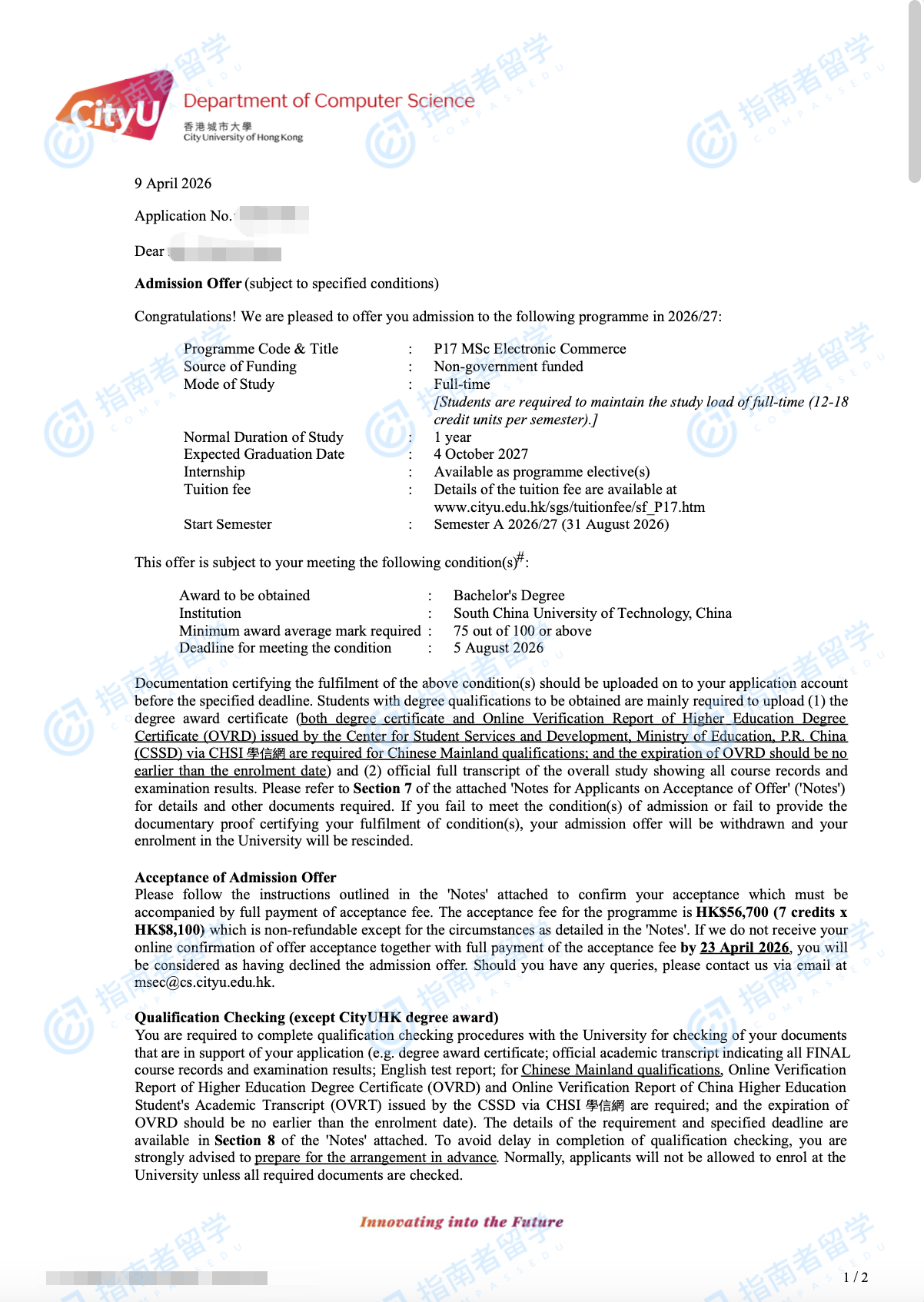 香港城市大学电子商贸理学硕士研究生offer一枚