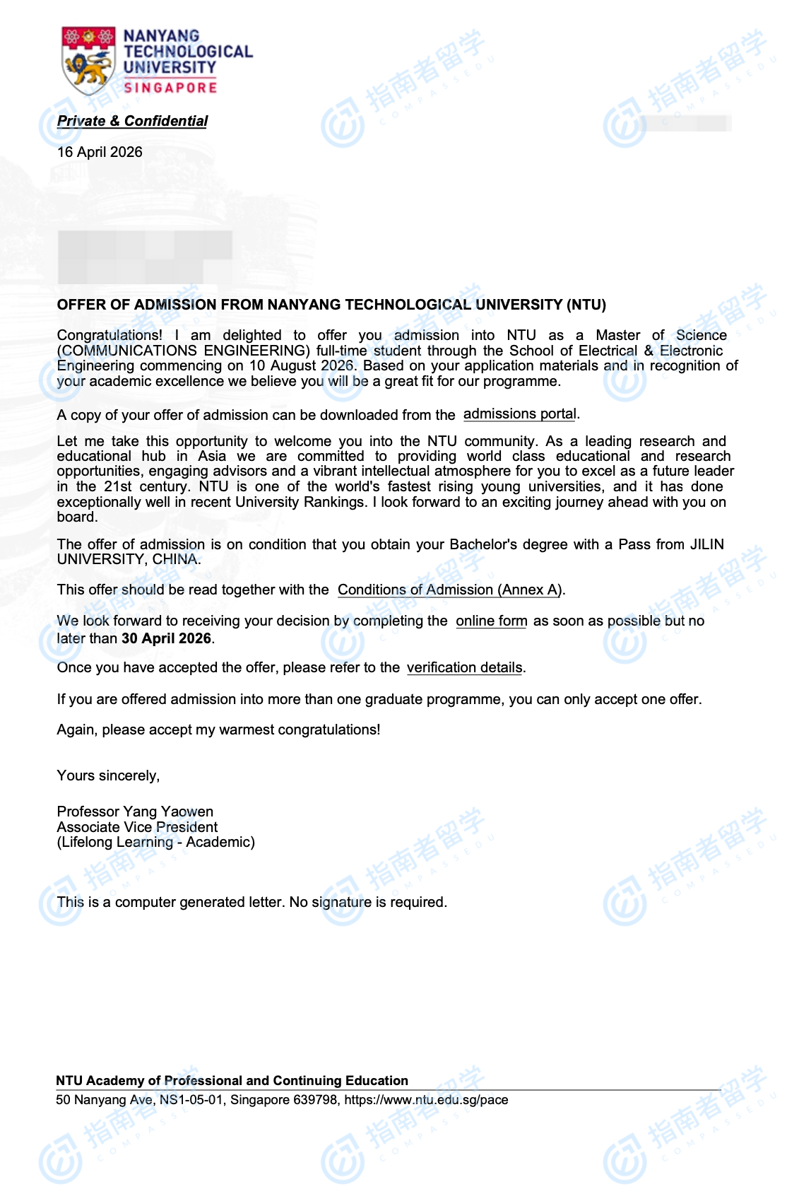 南洋理工大学通信工程理学硕士研究生offer一枚