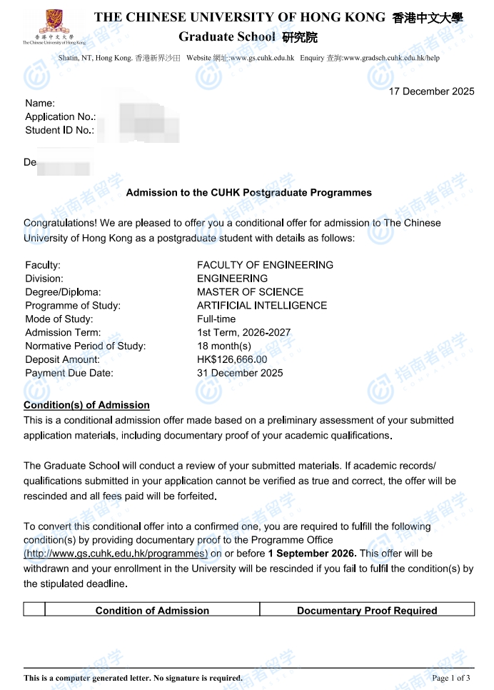 香港中文大学人工智能理学硕士研究生offer一枚
