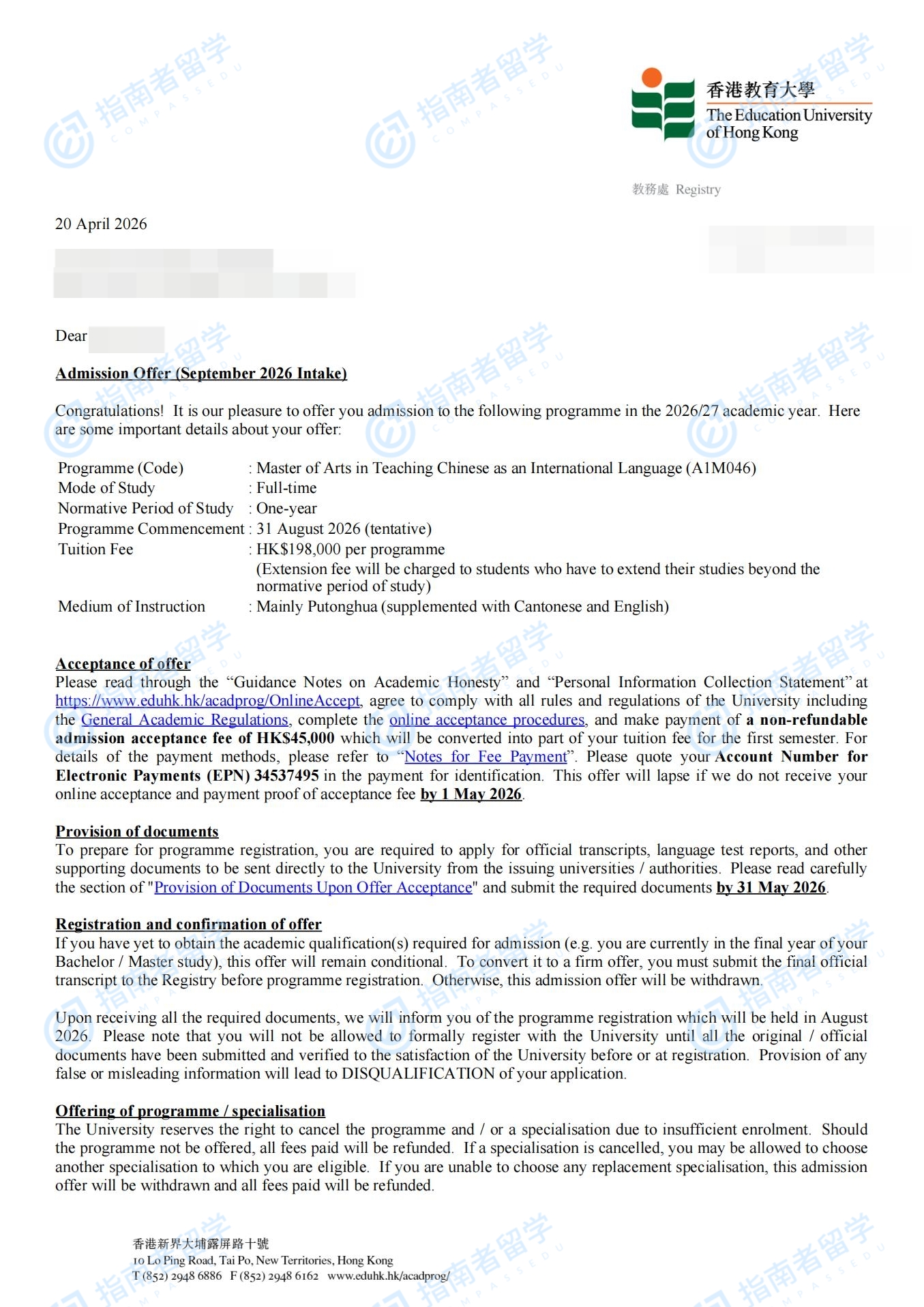 香港教育大学国际汉语教学文学硕士研究生offer一枚