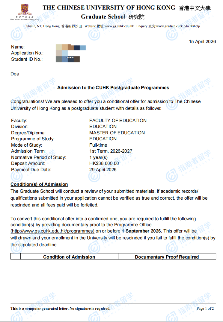 香港中文大学教育学硕士(综合课程)研究生offer一枚