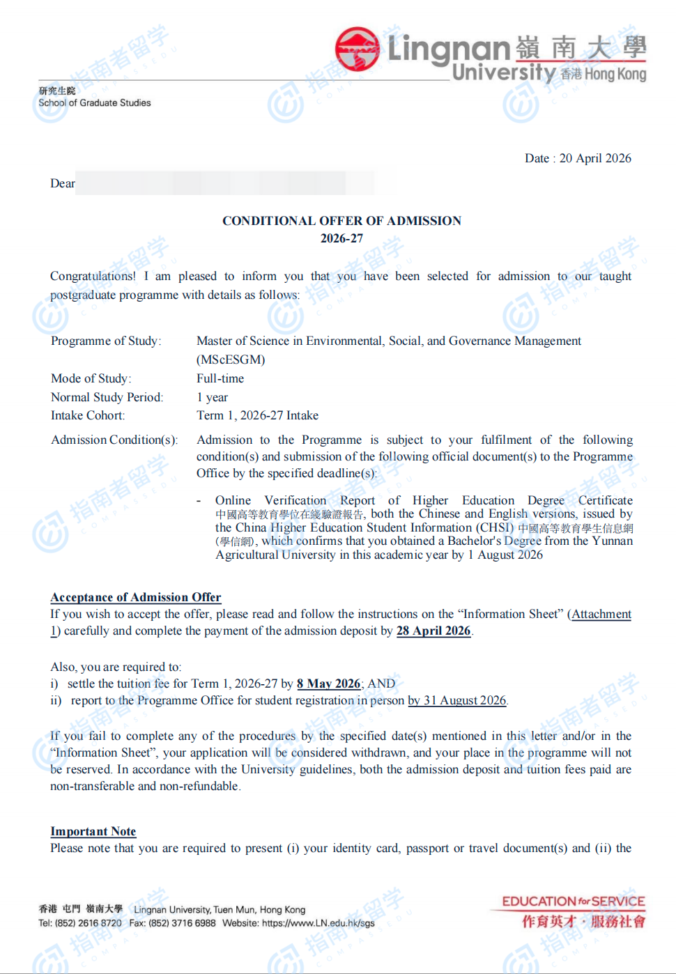 香港岭南大学环境、社会和公司治理管理理学硕士研究生offer一枚
