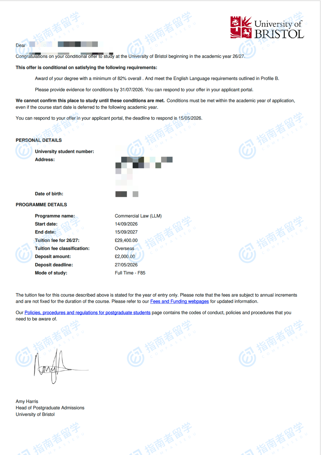 布里斯托大学商法法学硕士研究生offer一枚