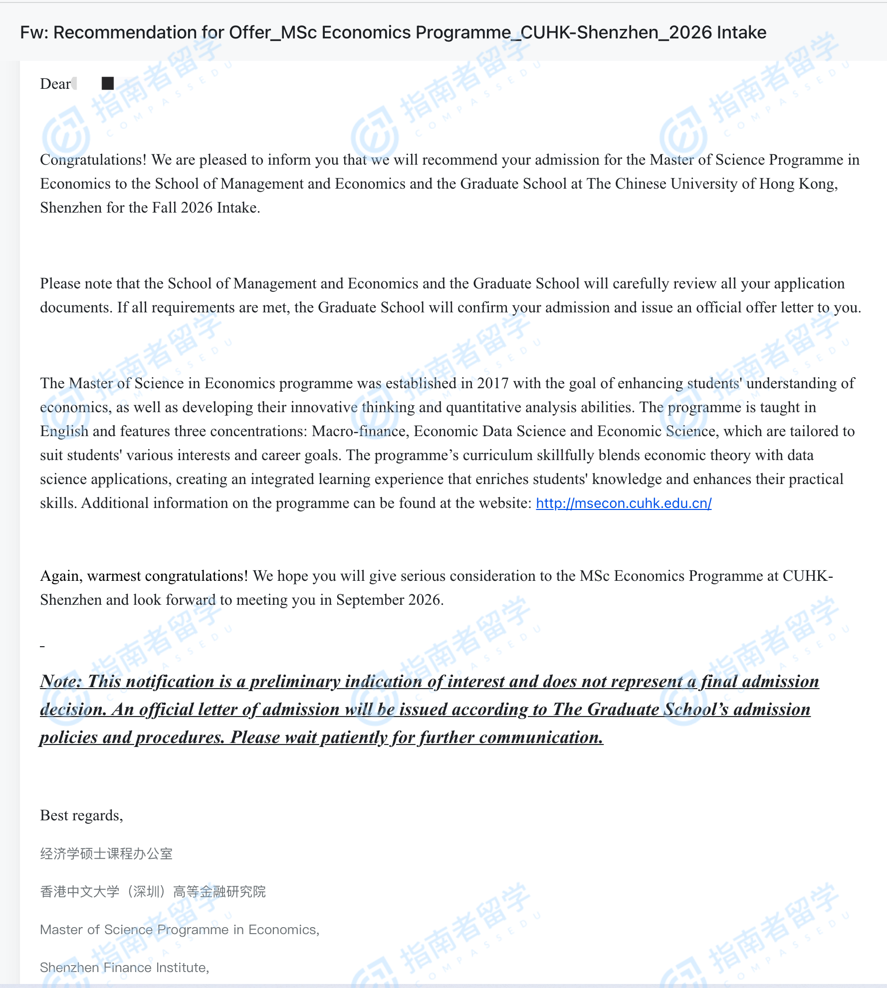 香港中文大学经济学理学硕士(CUHK-Shenzhen)研究生offer一枚