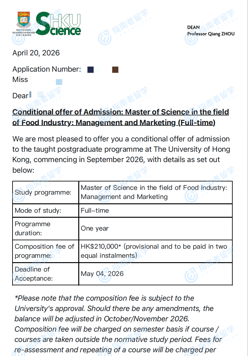 香港大学食品工业:管理与市场营销理学硕士研究生offer一枚