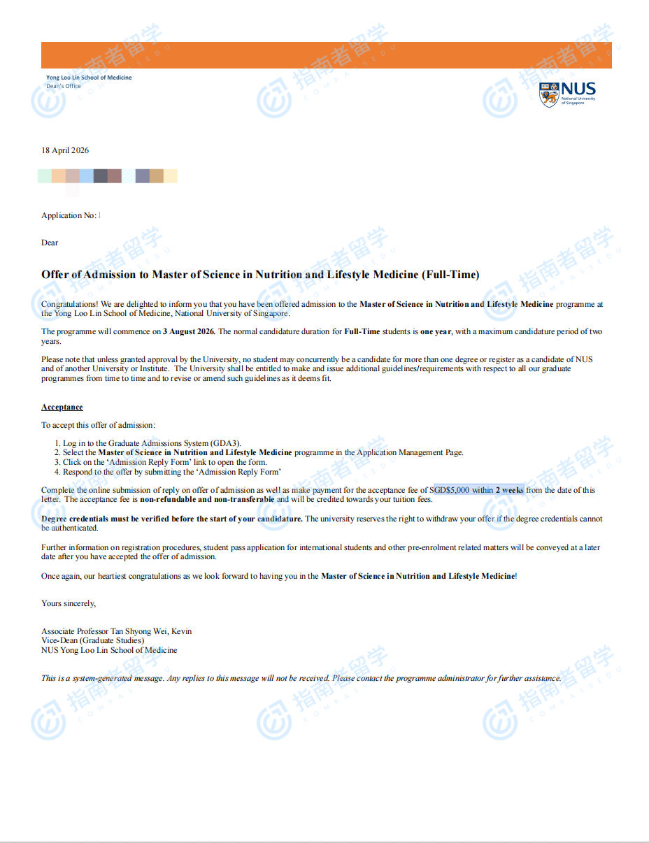 新加坡国立大学营养学与生活方式医学理学硕士研究生offer一枚