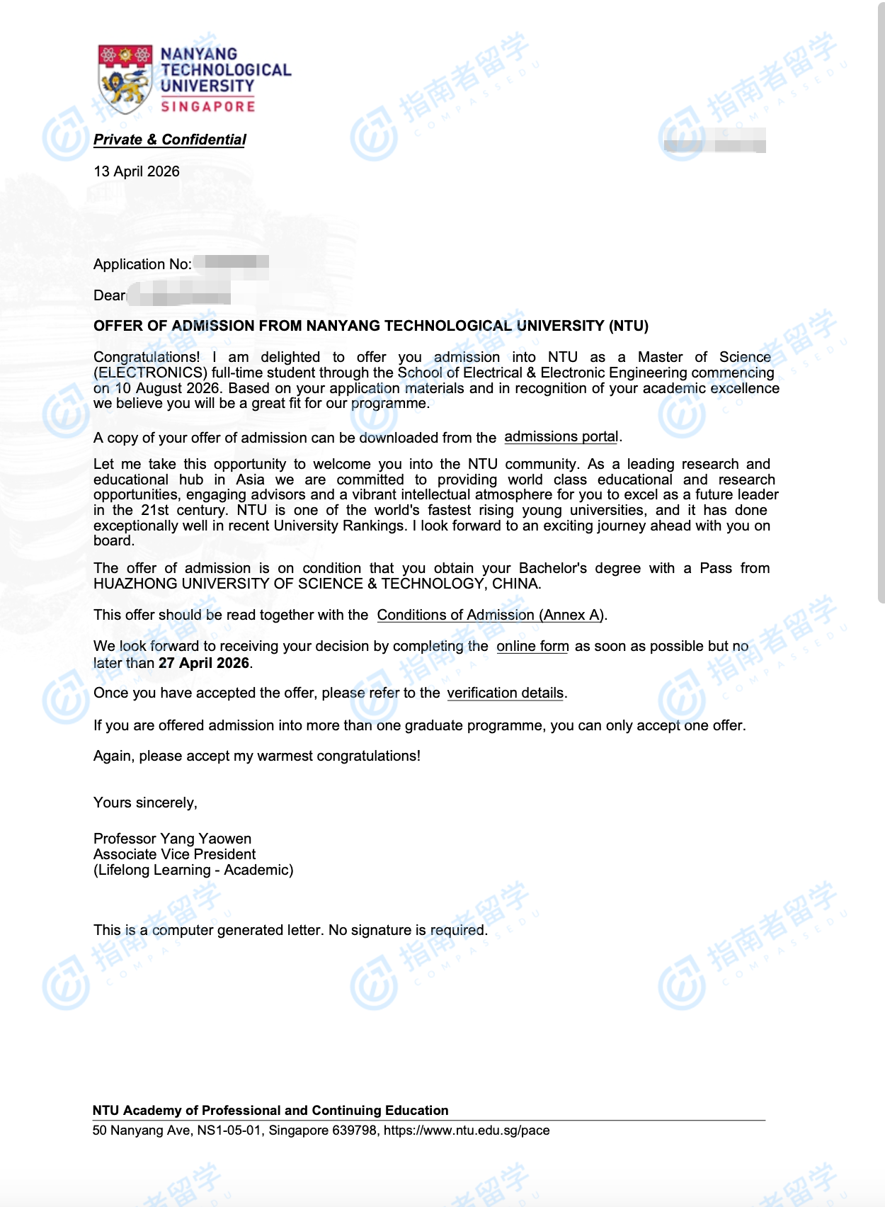 南洋理工大学集成电路与微电子学理学硕士研究生offer一枚
