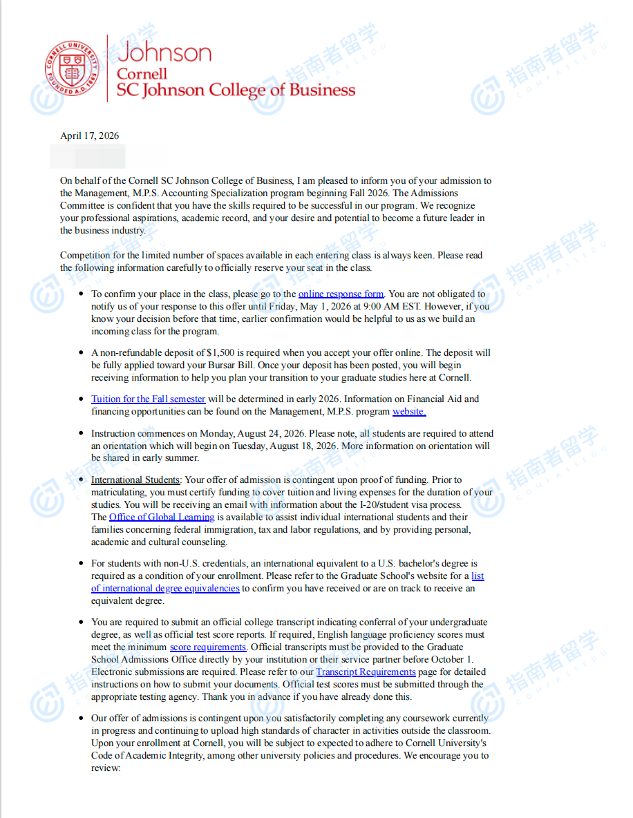 康奈尔大学管理学硕士-会计方向研究生offer一枚