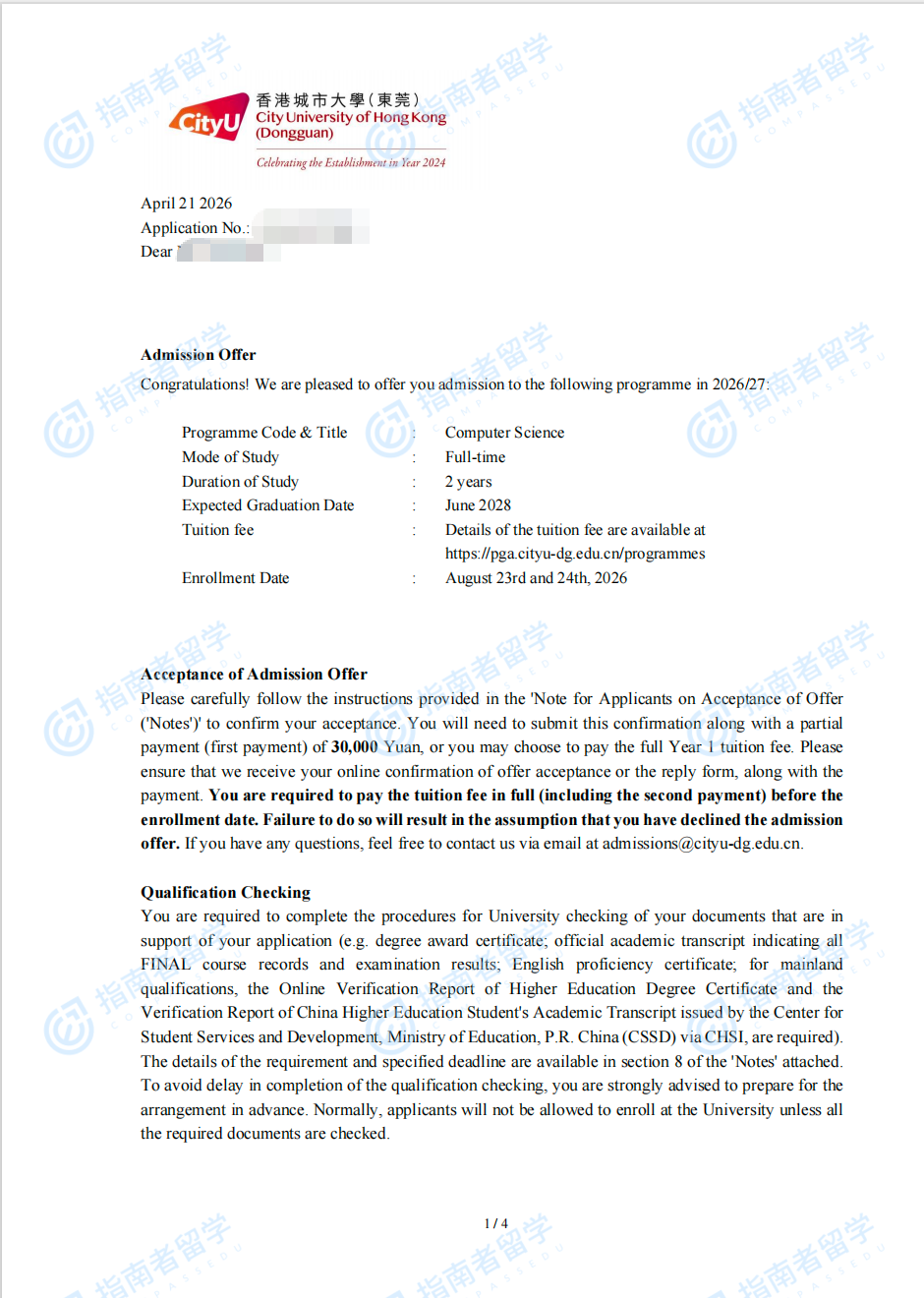 香港城市大学电脑科学理学硕士(CityU-DG)研究生offer一枚