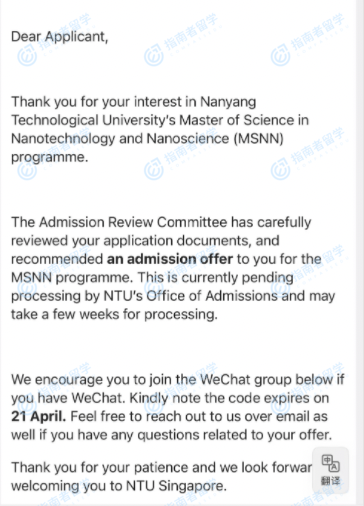 南洋理工大学纳米技术与纳米科学理学硕士研究生offer一枚