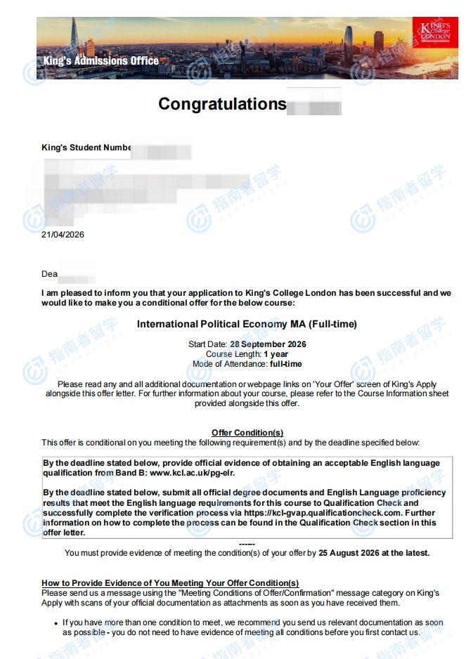 伦敦大学国王学院国际政治经济学文学硕士研究生offer一枚