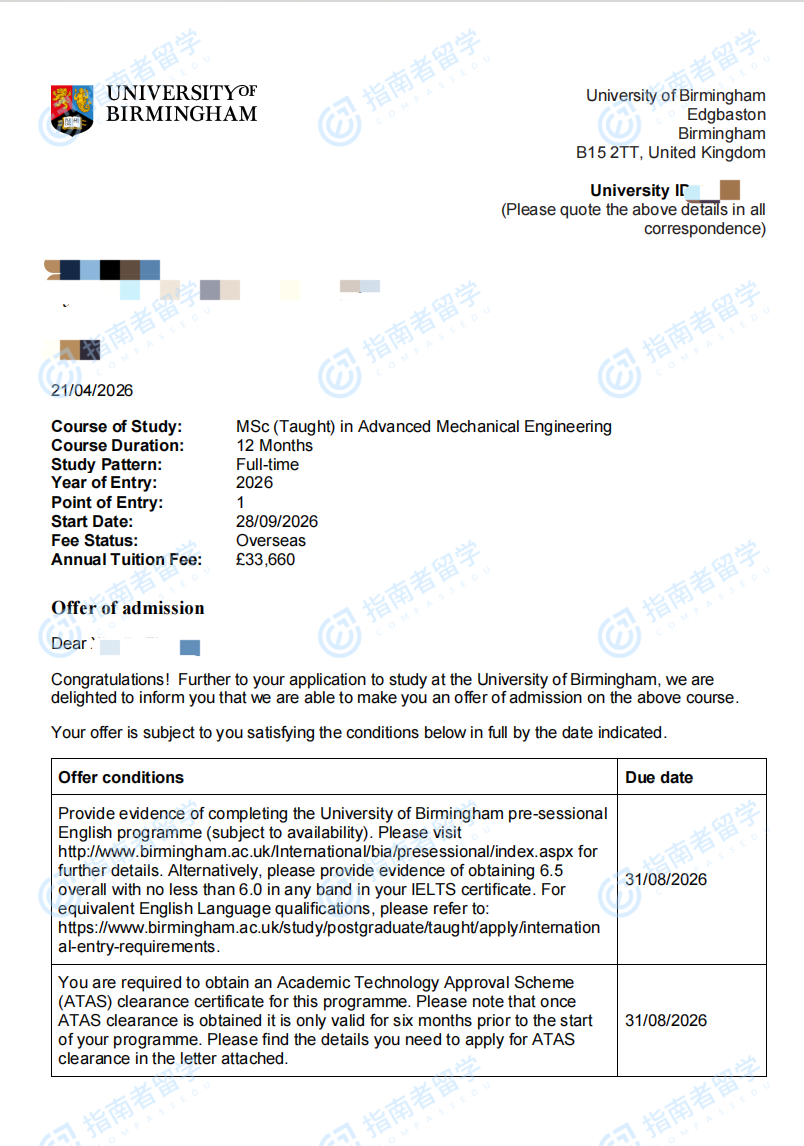 伯明翰大学高级机械工程理学硕士研究生offer一枚