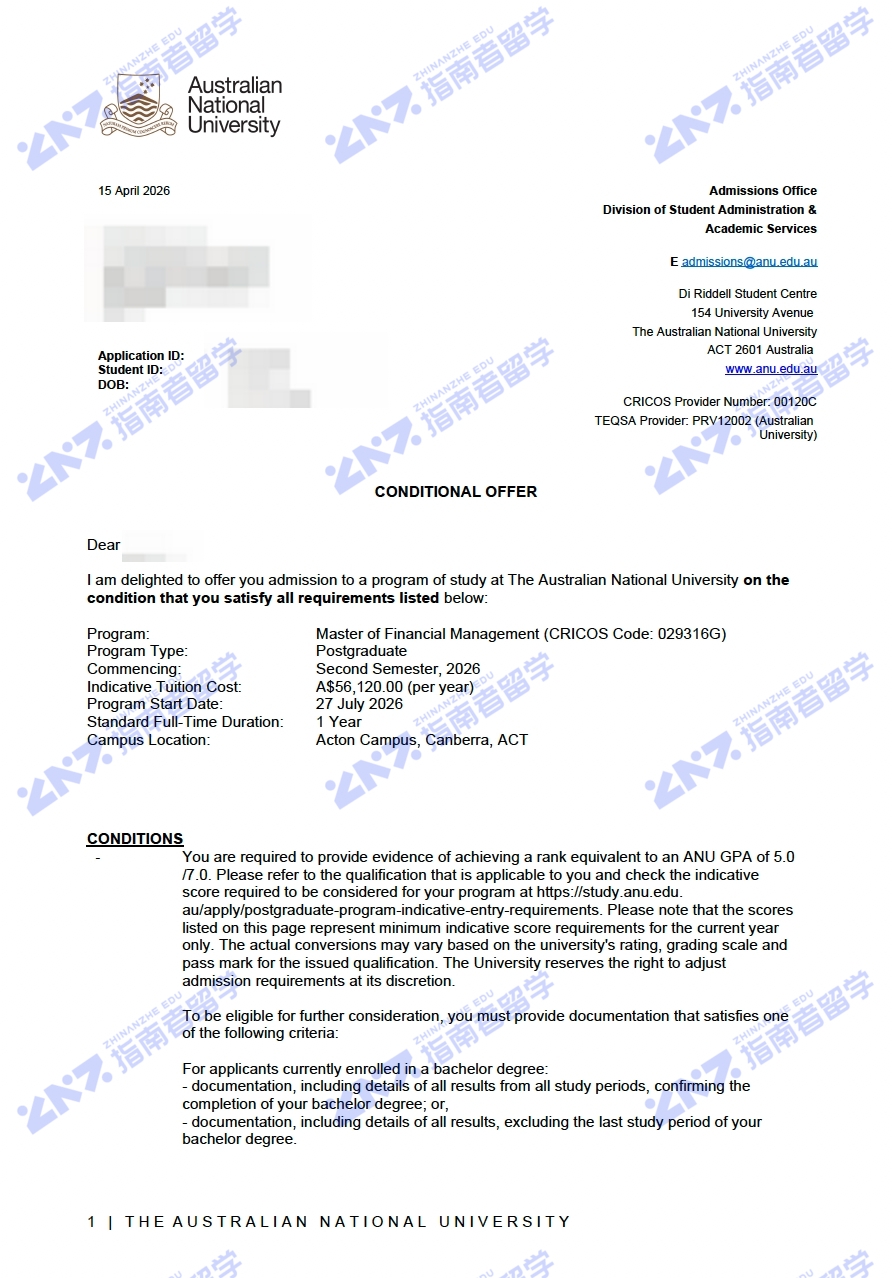 澳大利亚国立大学财务管理硕士研究生offer一枚