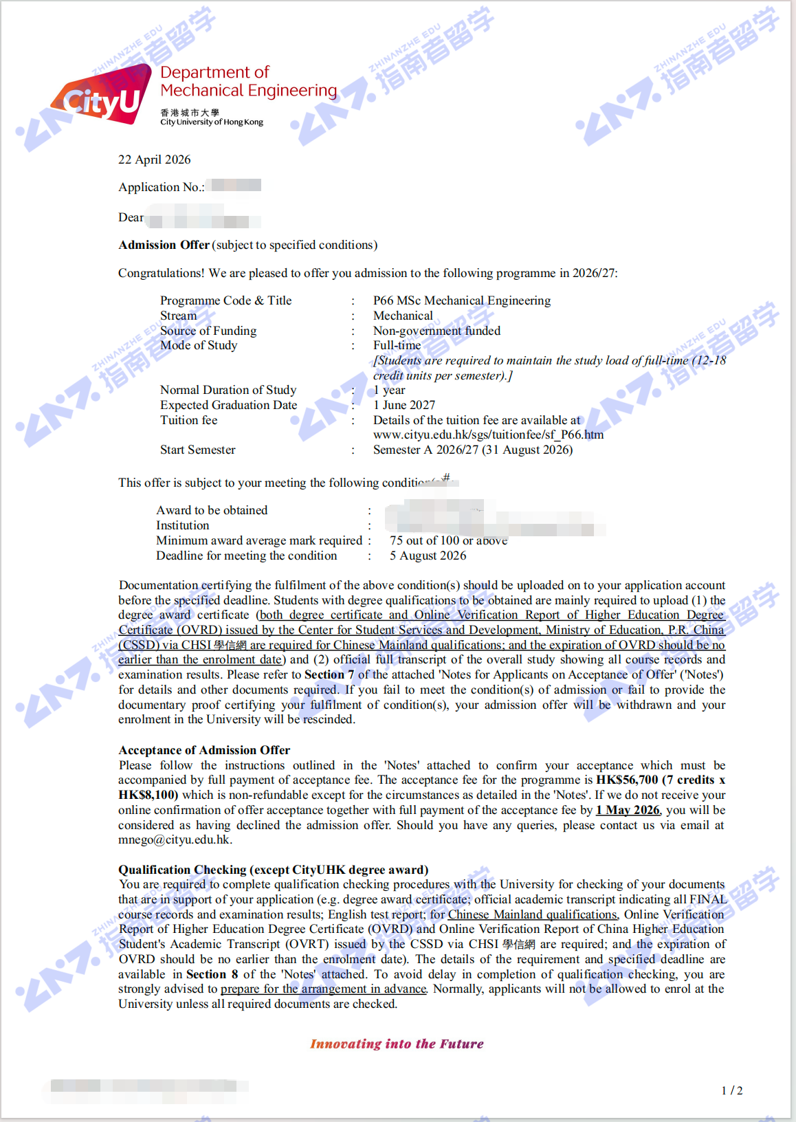 香港城市大学机械工程学理学硕士研究生offer一枚